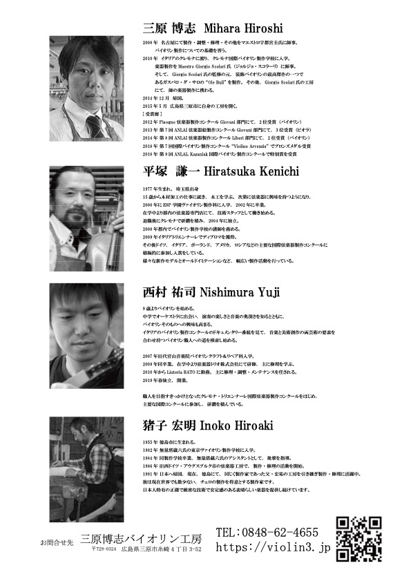 ※終了しました~展示会のご案内 Cremona Violin Collection 東広島 展示会三原博志ヴァイオリン工房 2023_11月展示会チラシ表 2023.09.29 Cremona Violin Collection 2023年11月12日(日)10:00~21:00 東広島芸術文化ホール くらら304,305号室 お問い合わせ先:三原博志バイオリン工房 0848-62-4655 pdfファイルはこちら